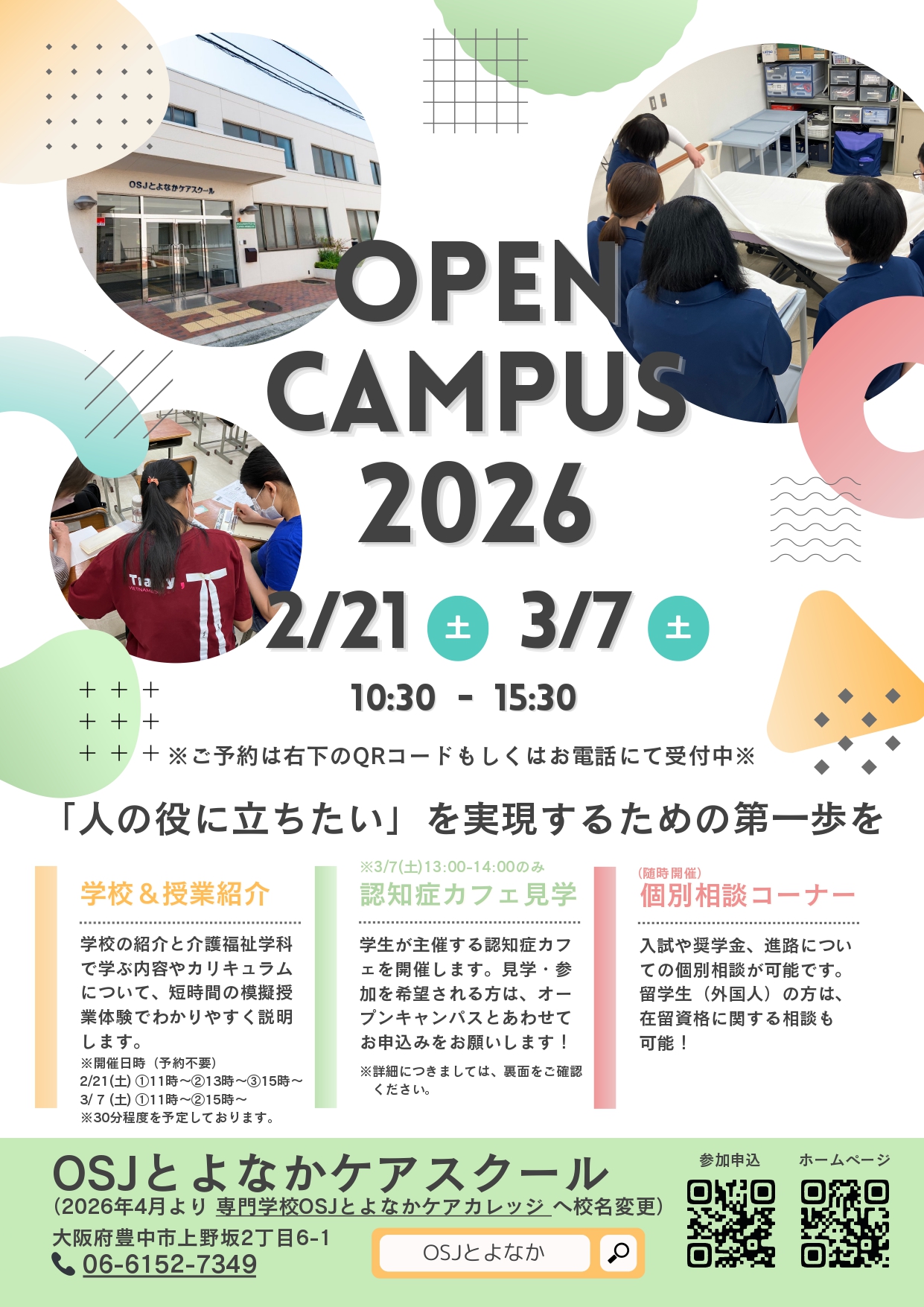 OSJとよなかケアスクールは、「社会福祉法人大阪府社会福祉事業団」と「一般財団法人豊中市医療保健センター」が協働し、『介護・福祉・医療』の人材育成に貢献するために設立した専門学校です。